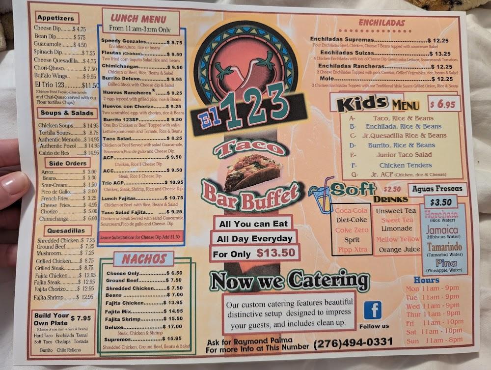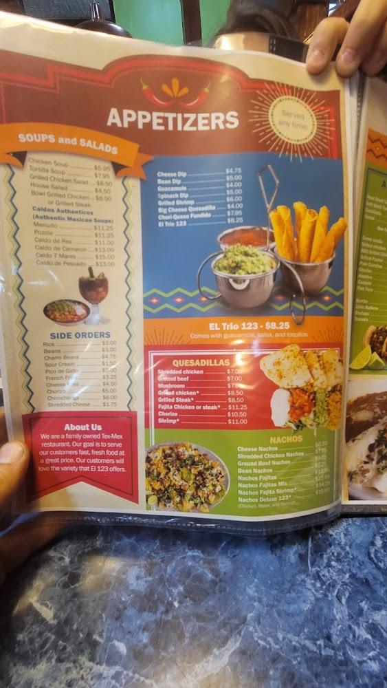 El 123 Tex-Mex presents a diverse menu featuring a wide selection of Tex-Mex dishes. The Taco Bar is a highlight, allowing diners to craft their unique meals with a variety of ingredients. Sizzling fajitas and cheesy enchiladas offer comforting options for larger appetites. Vegetarian menus cater to those seeking plant-based delights, ensuring no one leaves hungry. The children's menu is thoughtful, featuring smaller portions that appeal to younger diners. Don’t miss the house-made sauces and the fresh salads that accompany many meals, enhancing the Tex-Mex experience. Desserts complete the meal, offering a sweet ending to unforgettable flavors. The reasonable price range between $10 to $20 allows everyone to explore various dishes.